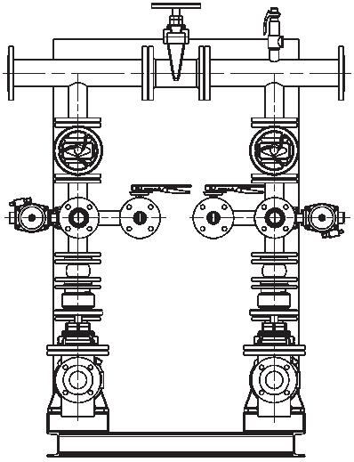 消防增压给水设备一般为两台消防泵(一用一备)集中布置的供水机组,基本上可满足各种消防水系统设计要求。考虑到石化、煤矿等特殊场合的设计参数要求大,我们同时开发了三台消防泵(两用一备)集中布置的供水机组,通过两台消防泵并联同时运行达到大的设计参数要求。