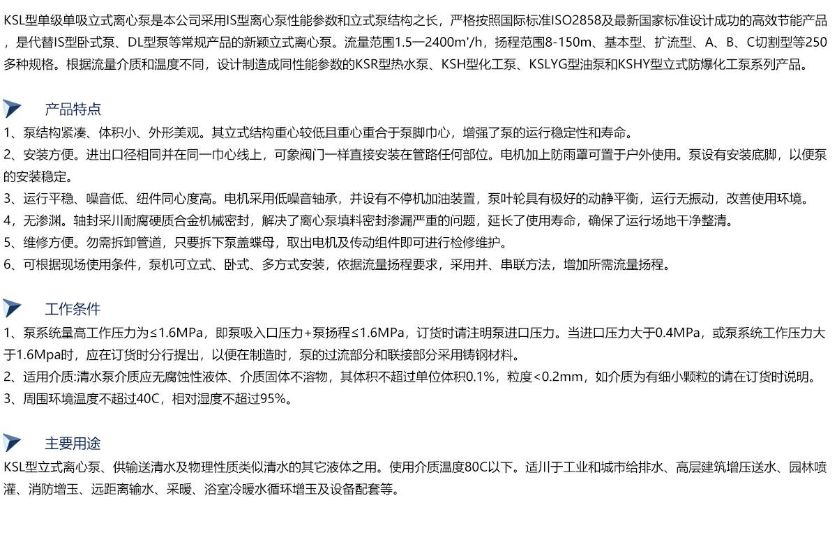 KSL型单级单吸立式管道离心泵是本公司采用IS型离心泵性能参数和立式泵结构之长,严格按照国际标准ISO2858及国家标准设计成功的高效节能产品,是代替IS型卧式泵、DL型泵等常规产品的新颖式离心泵。流量范围1.5~1200m3/h,扬程范围8~150m,分基本型、扩流型、A、B、C切割型等250多种规格。根据流体介质和温度不同,设计制造成同性能参数的KSR型热水泵、KSH型化工泵、KSYG(YG)型油泵和KSHY型立式防爆化工泵系列产品。