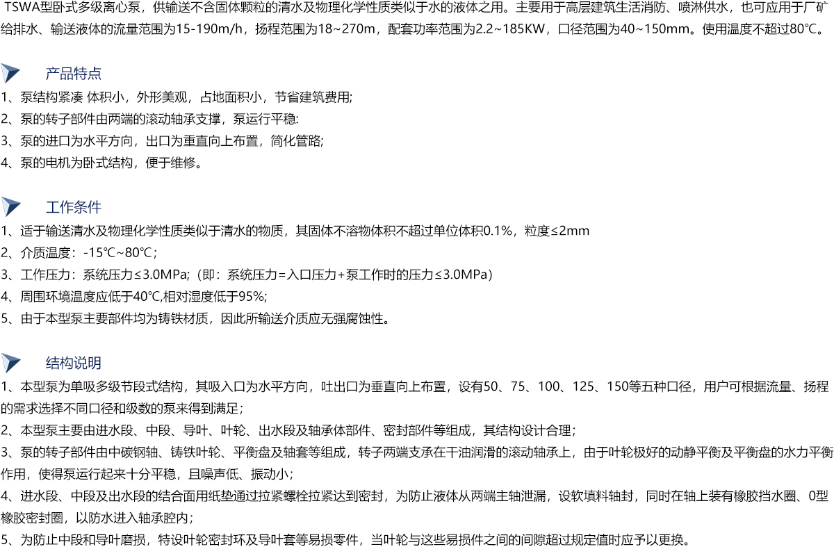 TSWA型卧式多级离心泵是我公司在TSW型泵的基础上吸收国内外多种多级离心泵的优点改进而成的新一代产品,符合JB/T53058-93质量标准。 本系列泵由于采用了的水力模型及低转速电机,因而具有高效节能、运行平稳、噪声低、振动小等优点,同时,易损件寿命成倍增长大六延长了泵的使用寿命。该系列泵主要适用于城市高层建筑给排水及消防用水,工厂、矿山给排水,远距离输水,生产工艺循环中用水,暖通空调循环、生活用水等。