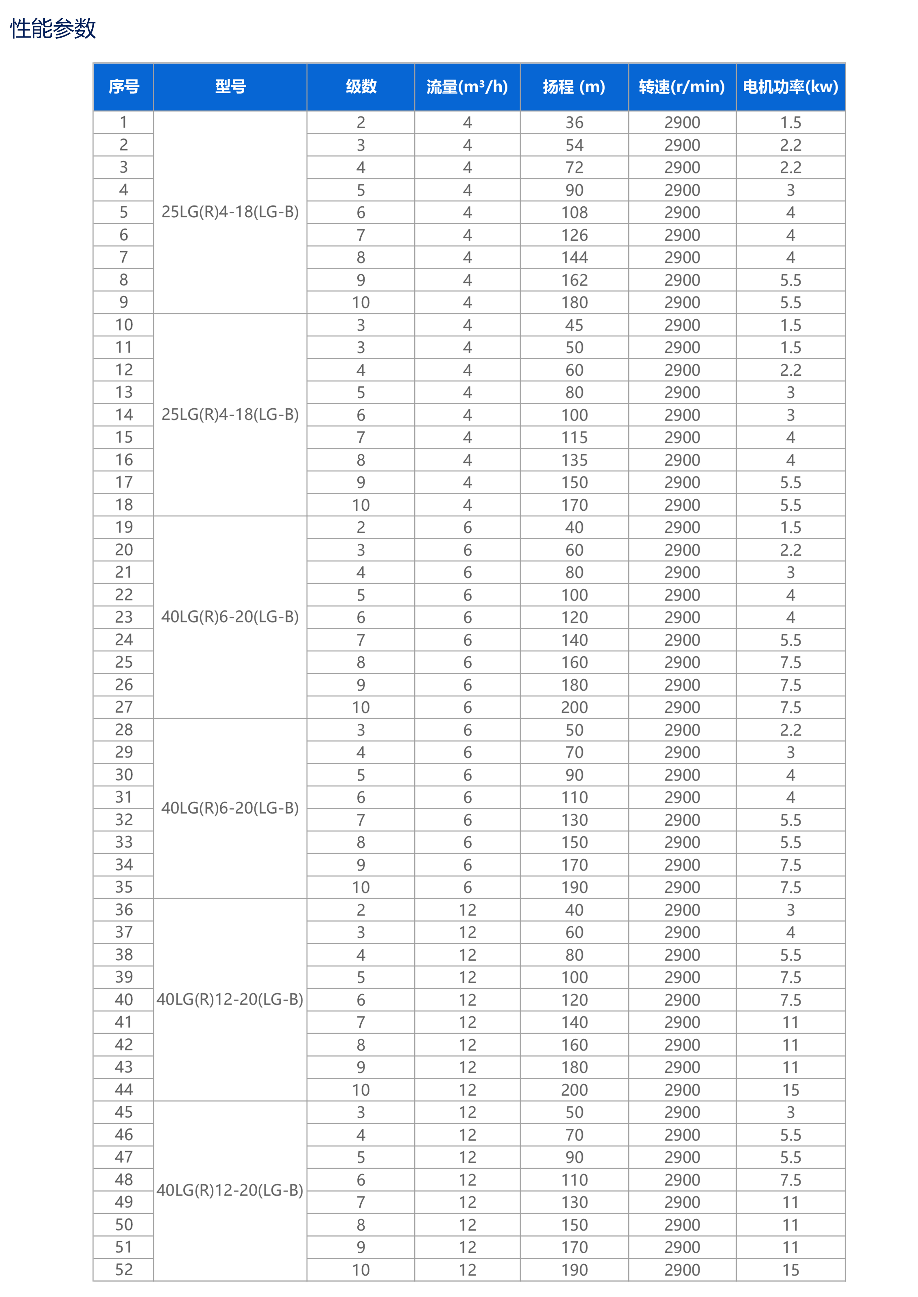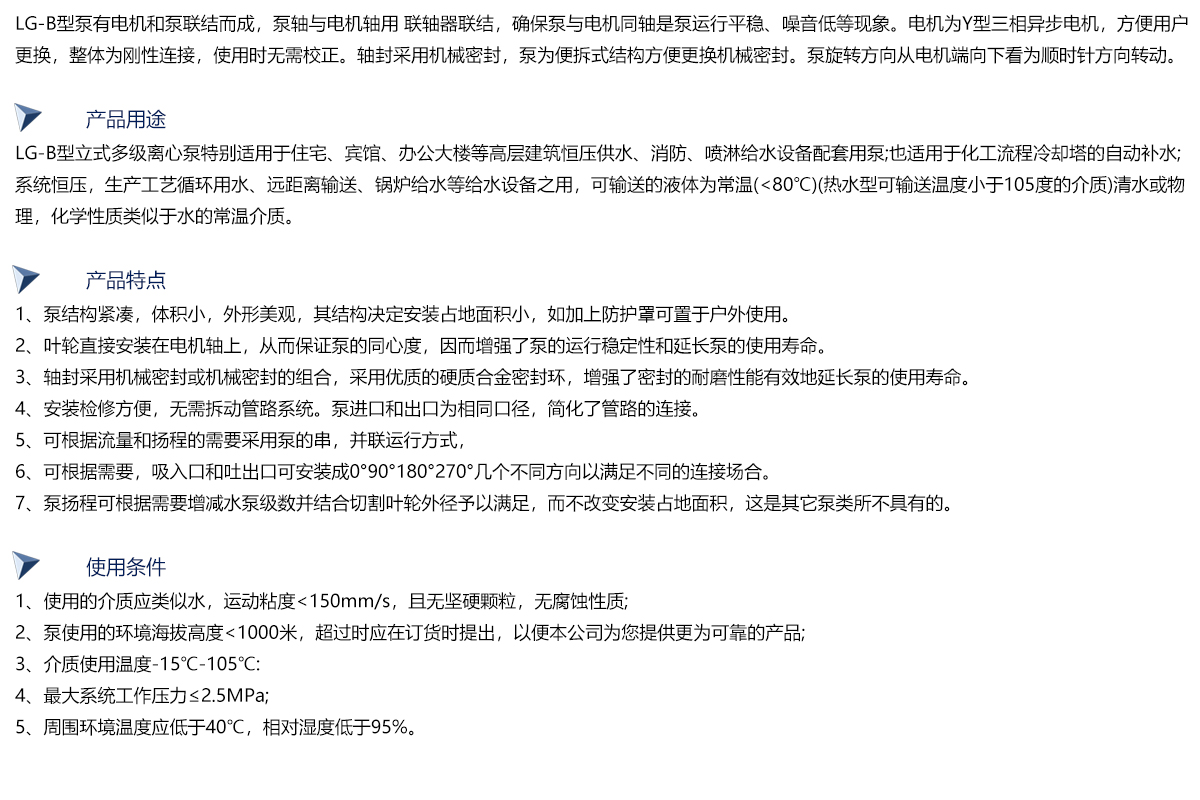 LG-B系立式、单吸、多级分段式便拆式离心泵是根据高层建筑恒压供水及消防行业的实际需要开发的新一代给水产品。该泵采用国内水力模型,经过本厂技术人员的精心设计,因此该泵效率高、性能稳定、噪音低、使用寿命长、外形美观、占地面积少、维修方便、重量轻等优点。