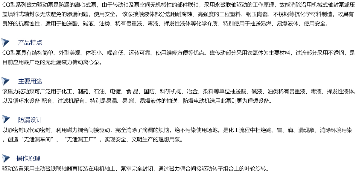 磁力泵以静密封取代动密封,使泵的过流部件处于密封状态,彻底解决了其他泵机械密封无法避免的跑、冒、滴之弊病。磁力泵选用耐腐蚀、高强度的工程塑料、钢玉陶瓷、不锈钢等作为制造材料,因此它具有良好的抗腐蚀性能,并可以使被输送介质免受污染。