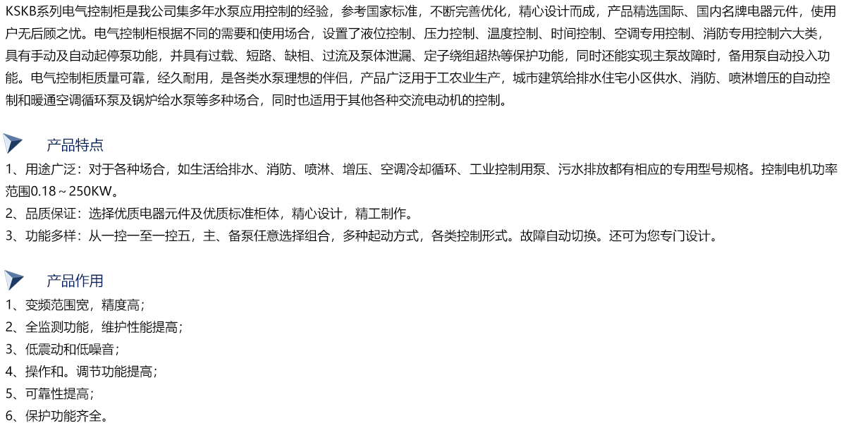 此系列全自动变频控制柜是我公司吸收国内外水泵控制的先进经验,经过多年生产和应用,不断完善优化后,精心设计制作而成。变频控制柜具有过载、短路、缺相保护以及泵体漏水,电机超温及漏电等多种保护功能及齐全的状态显示,并具备单泵及多泵控制工作模式,多种主备泵切换方式及各类起动方式。可广泛适用于工农业生产及各类建筑的给水、排水、消防、喷淋管网增压以及暖通空调冷热水循环等多种场合的自动控制。水泵控制柜内在质量优良,外形美观耐用,安装操作方便,是各类水泵安全可靠的伴侣。