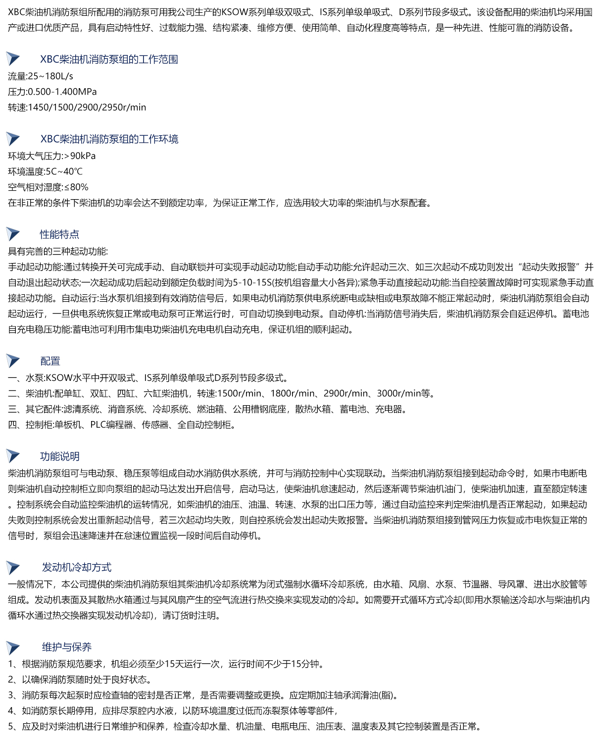 XBC型全自动柴油机消防泵组作为一种固定式消防灭火设备已经广泛应用于消防分流,尤其是在没有电源或电源(市电)不正常等意外情况下的消防给水。机组中所配的水泵为卧式单级、多级消防专用泵,所配的柴油机均为国内内燃机行业骨干企业生产的495、4135、X6135、12V135等系列机型,根据用户需要亦可配置其它柴油机作为动力机。主要由柴油机、消防泵、联接装置、油箱、散热器、蓄电池组、智能型全自动控制屏等组成。