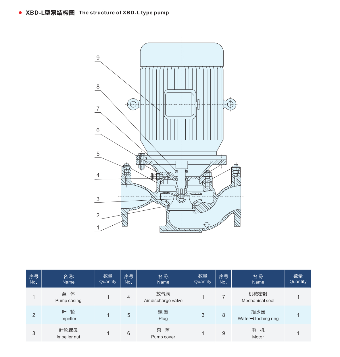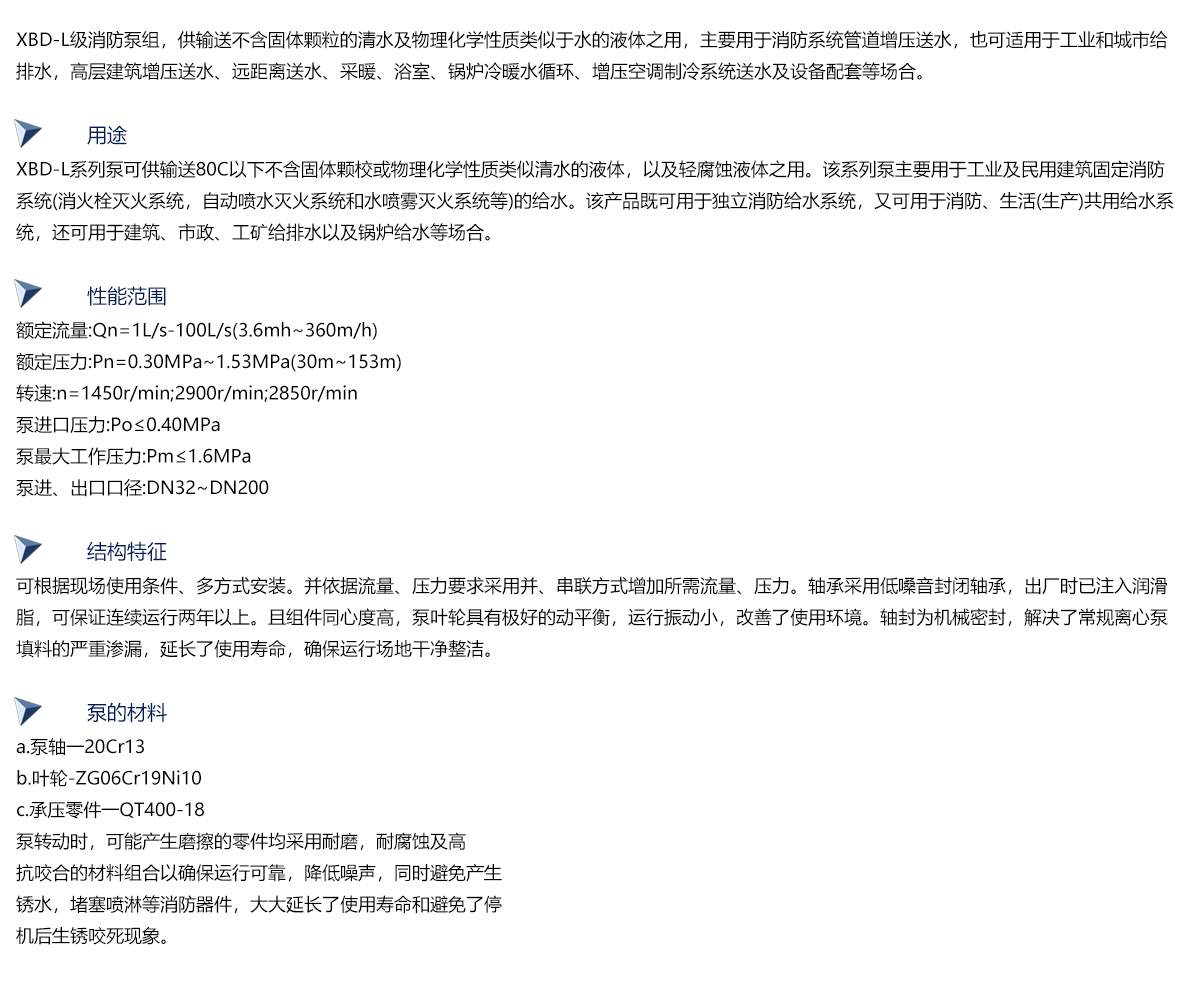 XBD-L系列单级单吸立式固定式消防泵(组)是本公司根据国内工矿企业、工程建设、高层大厦消防之需,严格按照国际标准ISO2858和最新国标GB6245《消防泵》设计制造开拓的新颖产品。 产品经国家消防装备质量监督检测中心封样检测质量性能全面符合GB6245国标要求。产品性能达到国内同类型产品先进水平。